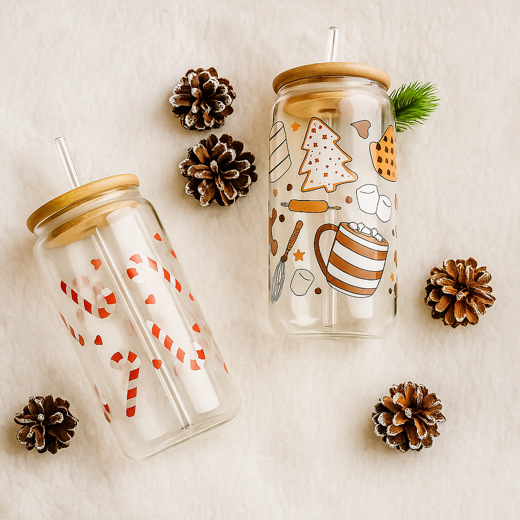 - Ces verres uniques sont équipés d'un capuchon en bambou et d'une paille en verre, personnalisés avec un thème de Noël.